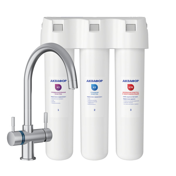 Обратноосмотические фильтры используются для абсолютной защиты от накипи, т.к. полностью устраняют соли жесткости из воды.нетЧисло ступеней очисткиКартриджи последовательно очищают воду и от видимых примесей, и от растворенных. Первый картридж задерживает более крупные частицы, а каждый последующий - более мелкие. Чем больше ступеней - тем лучше фильтр очистит воду: поймает более мелкие видимые частицы ржавчины, песка и ила, успеет захватить из воды максимум растворенных примесей - хлора, нитратов, тяжелых металлов и других.4МинерализацияПроисходит после финишной очистки воды. Необходима прежде всего в фильтре обратного осмоса, поскольку такой фильтр полностью устраняет из воды все примеси, в том числе минералы. Минералы добавляются в оптимальной концентрации - для пользы и привычного вкуса воды.нетПостфильтрацияФинальный этап очистки воды: картриджи постфильтрации удаляют самые мелкие механические частицы и кондиционируют воду, придавая ей более приятный вкус.нетНакопительная емкостьОбычно нужна в фильтрах обратного осмоса. Глубокая фильтрация требует времени. Чтобы Вам не приходилось ждать, пока вода наберется в чайник или кастрюлю, почти во всех моделях используется накопительный бак для чистой воды или другая емкость. В стандартном фильтре обратного осмоса под мойку воды в баке достаточно для семьи из 5-6 человек.нетФильтрующий модуль в комплектедаОтдельный крандаДавление в водопроводе не более, атмМаксимальное давление воды на входе в систему, при котором возможна стабильная работа фильтра.6,5Ширина, смОбратите внимание на габариты фильтра, и измерьте, сколько свободного пространства в предполагаемом месте установки.26,0Глубина, смОбратите внимание на габариты фильтра, и измерьте, сколько свободного пространства в предполагаемом месте установки.9,0Защита корпуса от гидроударовдаИсходная водаЖесткая вода – вода с избытком минеральных солей. От нее появляется накипь в чайнике, известковый налет на сантехнике и разводы на посуде. Мягкая вода – та, в которой мало минеральных солей. Нет накипи в чайнике и разводов на посуде. Фильтры для мутной воды и фильтры от ржавчины, как правило, имеют несколько стадий очистки и дополнительный полипропиленовый картридж. Он задерживает механические частицы ила, песка и ржавчины и защищает картриджи более глубокой очистки.мягкаяУстраняет мутностьМутность водопроводной воды может говорить о том, что в ней много мелких механических частиц. Важно, чтобы в фильтре был установлен дополнительные картридж механической предфильтрации (полипропиленовый) - он продлит жизнь остальным картриджам более тонкой очистки.даУстраняет ржавчину, бурый осадокЛюбой фильтр под мойку удалит из воды крупные и мелкие частицы ржавчины. Некоторые фильтры имеют повышенный ресурс по железу: они дольше служат в такой воде, поскольку лучше подходят для удаления из воды железа и механических частиц ржавчины.даЗащита от бактерийВсе проточные фильтры в той или иной степени защищают от бактерий. Например, добавление серебра препятствует их размножению. Это стандартная степень защиты. Если в семье есть дети, пожилые люди или аллергики, воду рекомендуется обеззараживать, то есть полностью удалять микроорганизмы. Повышенную защиту от бактерий дают фильтры с половолоконной мембраной. Это пучок трубо
